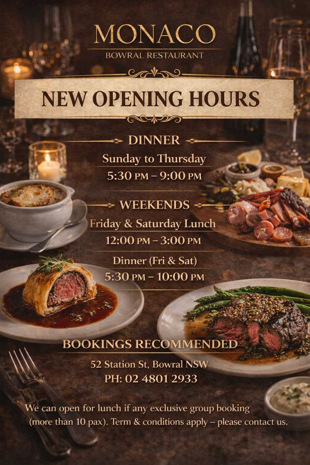 Nestled in the heart of Bowral, MONACO Bowral Restaurant invites you to embark on a culinary journey where global flavors meet French elegance. Our menu is a celebration of international cuisines, carefully crafted with fresh, locally sourced ingredients. Whether you’re craving mouthwatering appetizers, delectable main courses, or decadent desserts, our skilled chefs are dedicated to creating dishes that tantalize your taste buds.